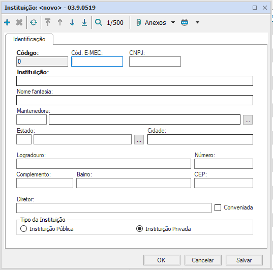 Normalmente são cadastrados o código, o nome da instituição (com nome e sigla, por padrão) ambos obrigatórios, e o endereço. O diretor não é necessário, por ser mutável, mas, apesar de não ser campo obrigatório, deve-se cadastrar o cód. E-MEC caso o aluno venha de transferência.