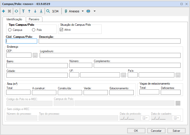 Apresenta tipo Campus/Polo, código e descrição como obrigatórios.