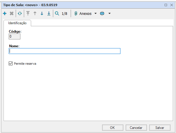 Possui código e nome como obrigatórios e apresenta um campo de seleção que permite reserva da sala.