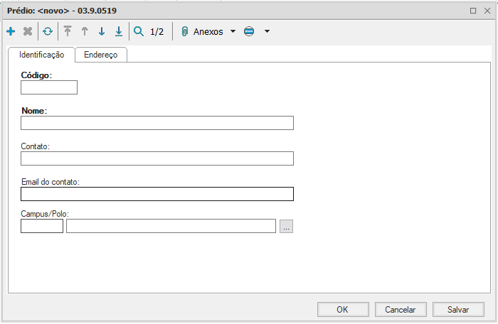 Ao acessar esse cadastro e incluir um novo registro, é iniciado o cadastro de um prédio, com código e nome como itens obrigatórios, mas conta também com informações de contato e endereço, e seu vínculo com Campus/Polo.
