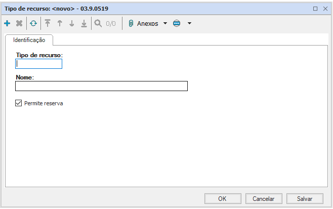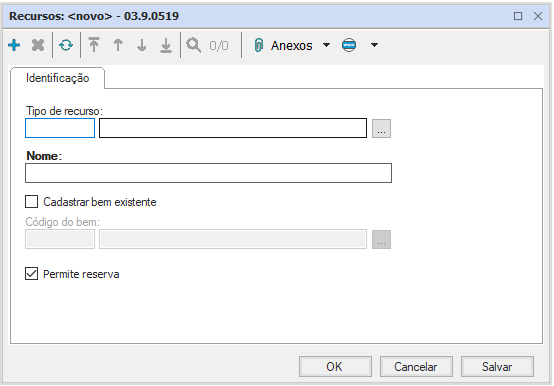 Apresenta tipo de recurso e nome como obrigatórios e possui campo de seleção para permissão de reserva do recurso cadastrado.