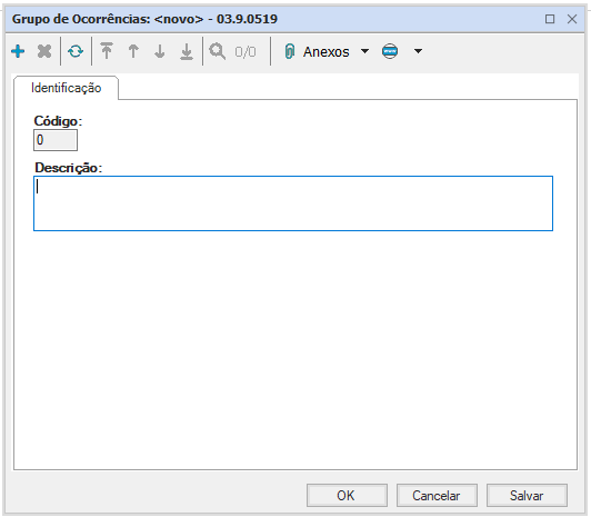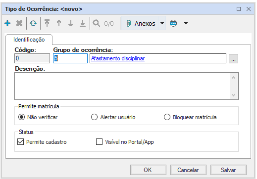 O cadastro dos tipos de ocorrências exige o código, com geração automática, o grupo de ocorrência, que deve ser vinculado dentre os grupos cadastrados, e a descrição.