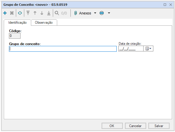 Deve ser cadastrado o grupo de conceito, fornecendo o código, de geração automática e o nome do grupo e salvando.