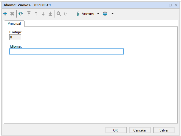 Possui apenas código e nome do idioma, ambos com preenchimento obrigatório.