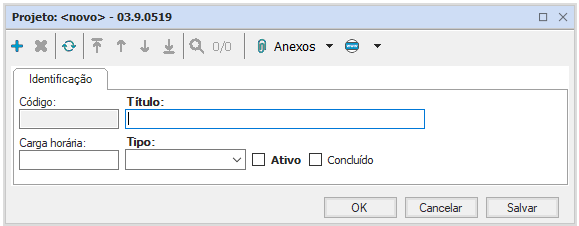 Exige preenchimento do título, tipo de projeto e sua ativação através da marcação do campo de seleção. Possui código com geração automática e permite preenchimento da carga horária.