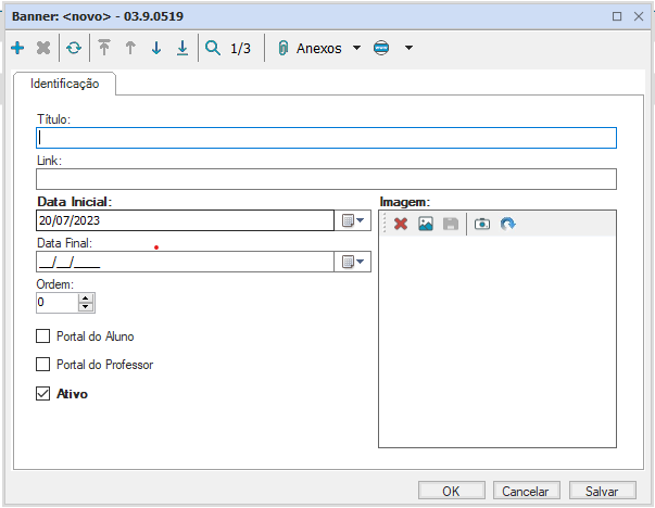 Área onde são cadastrados os banners que aparecerão no Portal do Aluno e/ou Professor. É feito o cadastro da imagem que constará no banner juntamente com o título, o link, a data inicial e final que o banner aparecerá no Portal, a ordem que esse banner aparecerá, caso esteja definido mais de um banner, em quais portais o banner deve aparecer e se esse banner está ativo.
