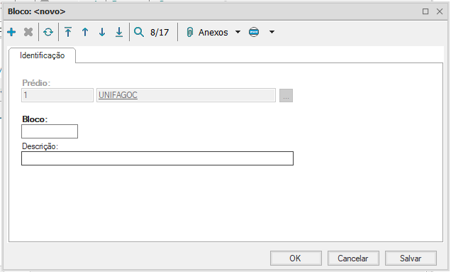 O cadastro de blocos exige código e descrição, e já vincula o prédio da qual o bloco é parte. Dentro dos anexos do bloco é possível realizar o cadastro das salas