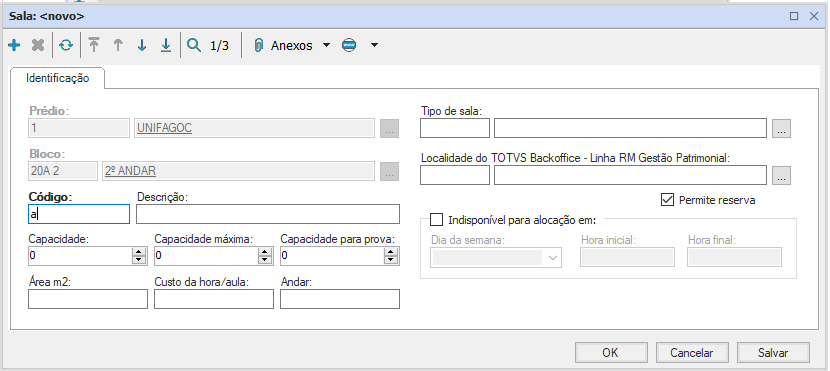 Cadastro que possui apenas o código como campo obrigatório mas, apesar do campo capacidade máxima não estar definido como obrigatório, deve ser preenchido, pois é um campo limitador do número de matrículas da turma destinada à sala especificada.