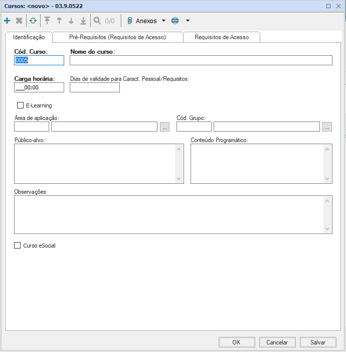 Neste cadastro devem-se preencher os dados obrigatórios: código do curso, nome do curso e carga horária e de forma opcional a data de expiração (quando tiver), área de atuação, grupo de curso (área específica), público-alvo, conteúdo programático, observações (quando tiver alguma informação relevante) e curso eSocial (quando o eSocial exigir algum curso de forma obrigatória)