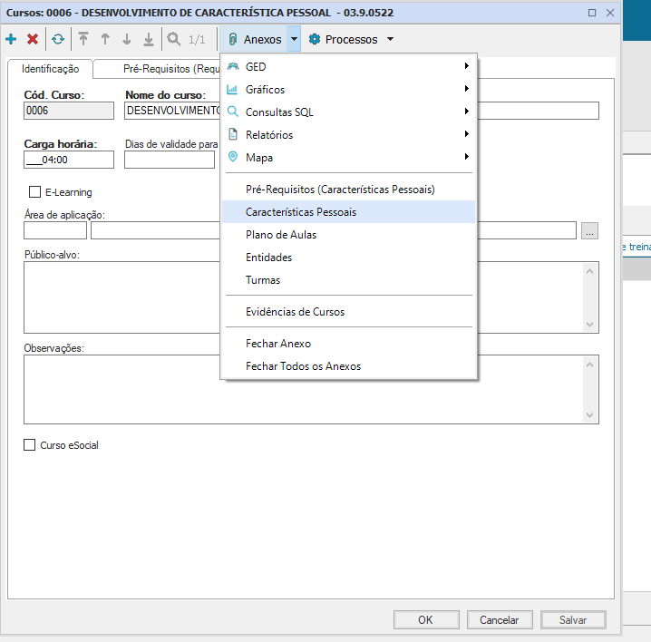 - Para vincular uma característica pessoal ao curso que está sendo cadastrado, clique em “Anexos- Características Pessoais”