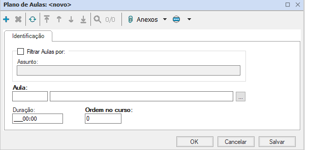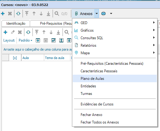 - Dentro do cadastro de curso, em anexos, há a opção “Plano de Aulas”, onde serão inseridas as aulas ministradas