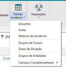 Em “Tabelas Auxiliares”, são feitos os cadastros das aulas, assuntos, motivos de ausência, grupo de cursos, área de atuação, grupos de entidades e campos complementares