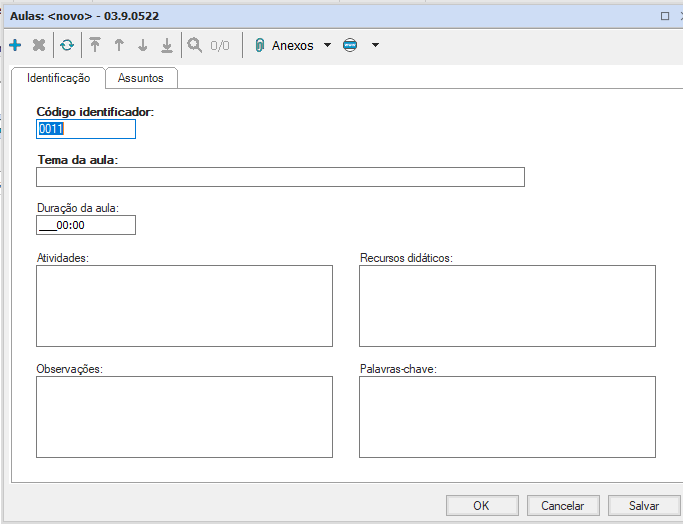 - Assuntos: Esse cadastro tem como objetivo definir os assuntos que serão ministrados nas aulas referentes ao curso em questão, podendo ser feito selecionando a opção “Assuntos”, em seguida apertando o ícone “Incluir” e preenchendo os campos