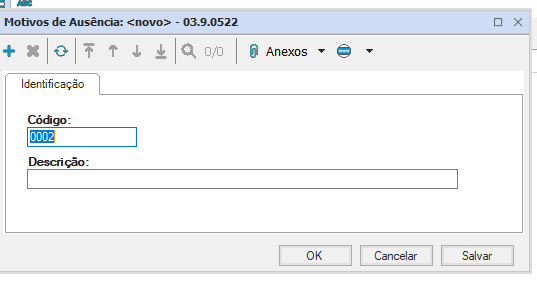 Para adicionar algum “Motivo de Ausência”, selecione a opção “Incluir” na tela inicial, preencha os campos: código e descrição, ou seja, o motivo da ausência e clique em “Salvar”