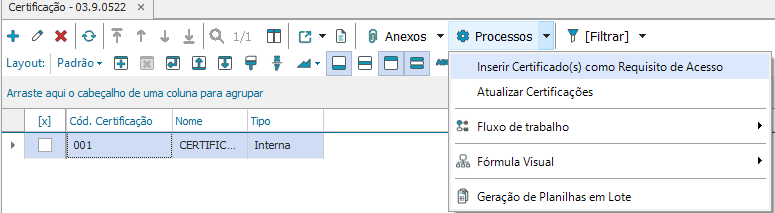 Para inserir as certificações como Requisito de Acesso e a atualização das certificações (quando a certificação for interna) selecione opção “Processos” e escolha a opção desejada