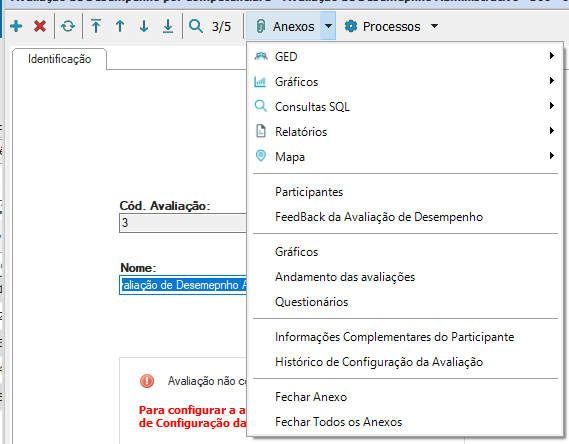 No cadastro da Avaliação de Desempenho, a opção “Anexos” exibe funcionalidades necessárias em relação a avaliação de desempenho, podendo modificar os participantes, obter feedbacks e gráficos após a conclusão da avaliação e acompanhar o andamento das avaliações