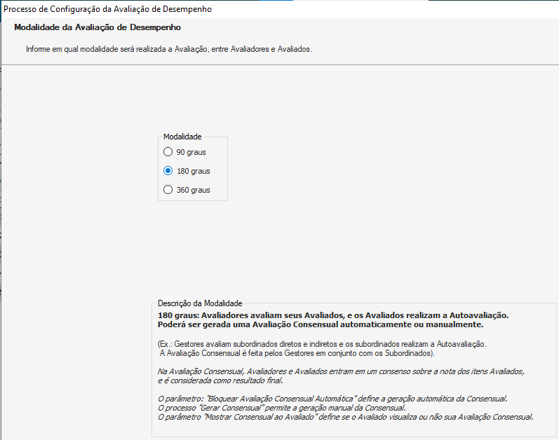 - Gerar Consensual: Executando este processo será possível gerar uma Avaliação Consensual, caso a mesma não tenha sido gerada automaticamente (disponível apenas para modalidade de 180º). Durante a execução do processo é possível: