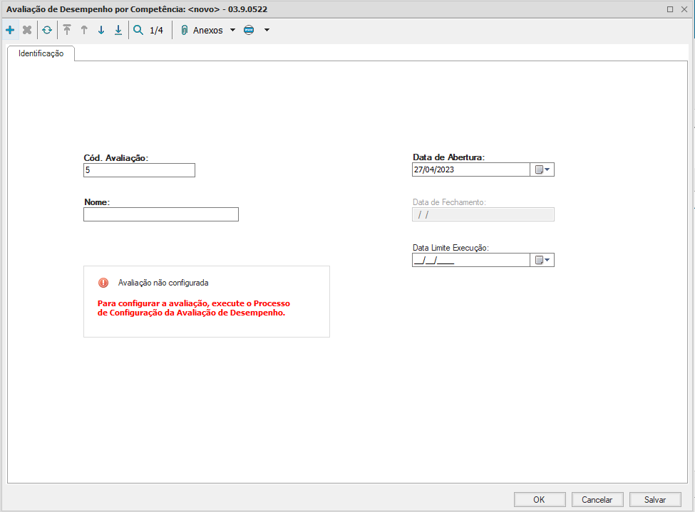 - Data de Fechamento: Não é editável, esse campo será preenchido quando executar o processo de fechamento da avaliação;