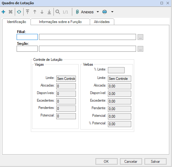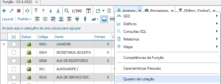 É preciso determinar os setores que as funções podem atuar, a opção quadro de lotação no sistema tem o objetivo de agrupar funções que realizam atividades com as mesmas competências. Para realizar esse processo, escolha a opção “Anexos- Quadro de Lotação” dentro da opção “Funções”