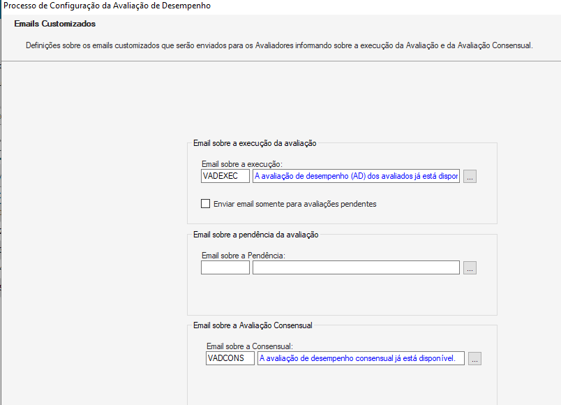 - Enviar e-mail de pendência para os Avaliadores A.D.: Executando este processo o sistema enviará para o avaliador um e-mail listando todas as avaliações pendentes (ainda não finalizadas).