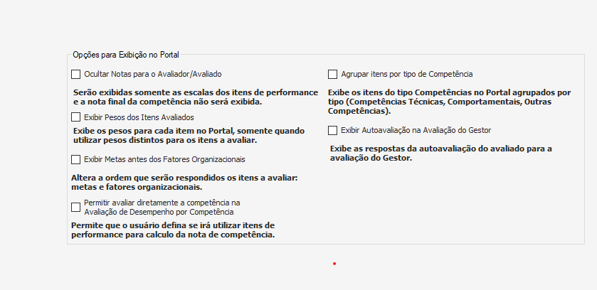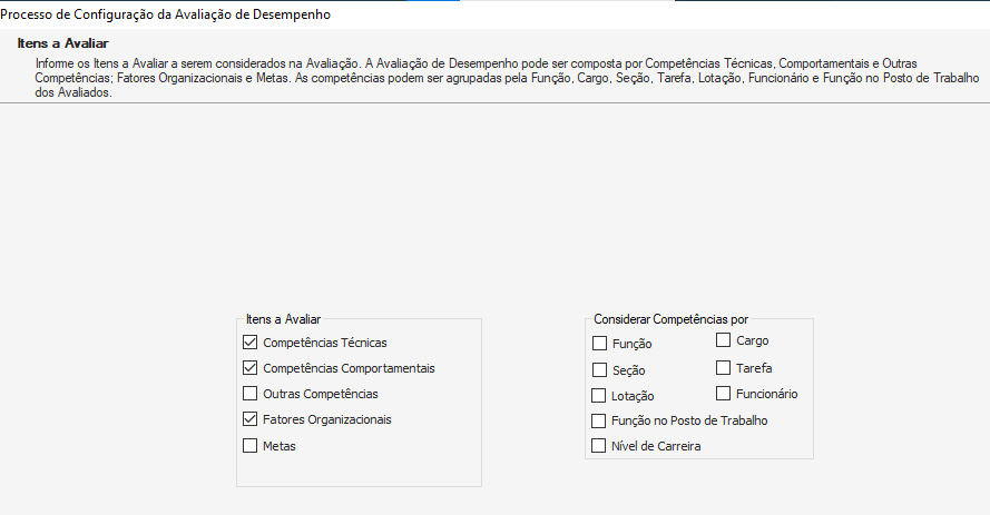 Na tela seguinte selecione os itens que serão avaliados, na avaliação de desempenho e como deve ser considerada a competência