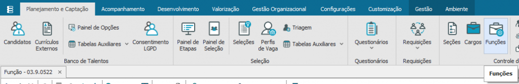 Para criar a Avaliação de Desempenho é necessário que antes sejam criadas as competências das funções (Link do Manual) e sejam definidos os setores que as funções poderão atuar. Para realizar esse processo, clique no “Módulo RH- Gestão de Pessoas” aba “Planejamento e Captação” opção “Funções”