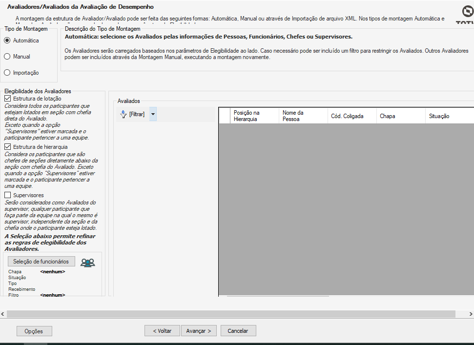 Na próxima tela, é necessário realizar a montagem da estrututa avaliador/avaliado, escolhendo o tipo de montagem, automática ( próprio sistema coloca baseando na eligibilidade dos avaliadores), manual (escolhendo manualmente os avaliados e avaliadores) ou importação (por XML)