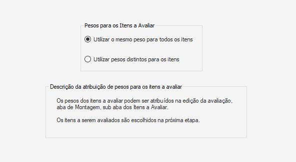 Em seguida é possível definir os pesos dos itens da avaliação ao selecionar uma das opções abaixo em relação aos pesos das notas