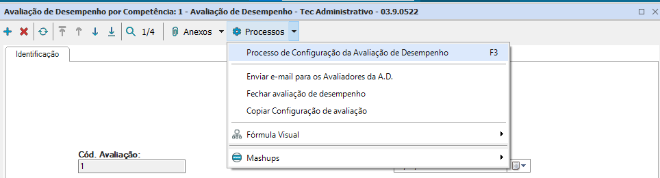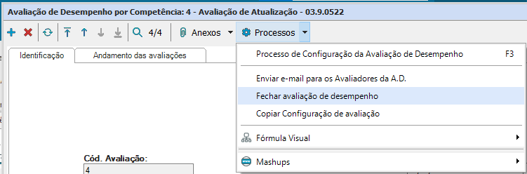 Para fechar uma avaliação de desempenho escolha dentro do cadastro de Avaliação de Desempenho a opção “Processos- Fechar Avaliação de Desempenho”