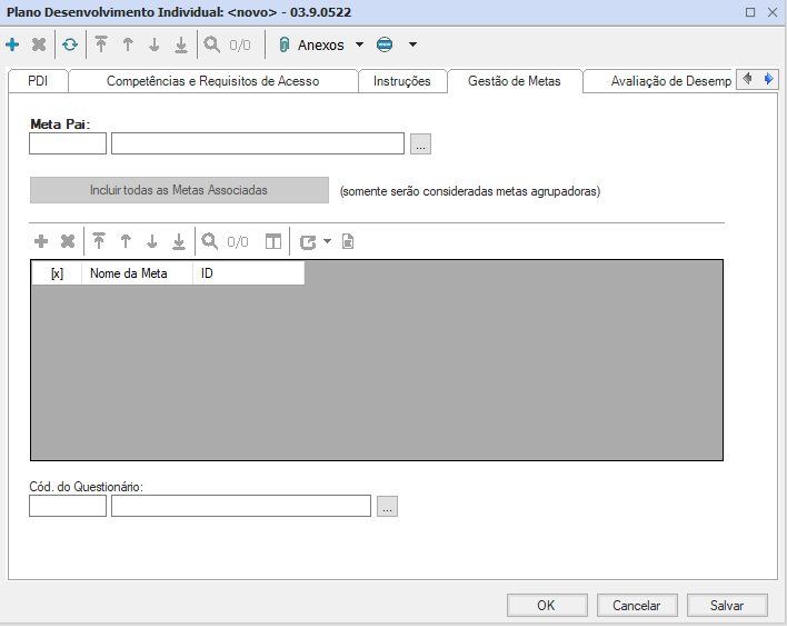 A próxima aba é onde você vincula a meta agrupadora (meta pai) para ser desenvolvida e o questionário (opcional) para ser respondido. Um ponto importante é que o questionário não impacta na nota do PDI