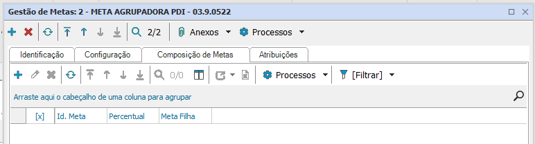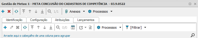 Caso defina o tipo de meta como “Agrupadora”ao preencher todos os campos da configuração e salvar, serão habilitadas as abas “Composição de Metas (metas filhas)” e “Atribuições”