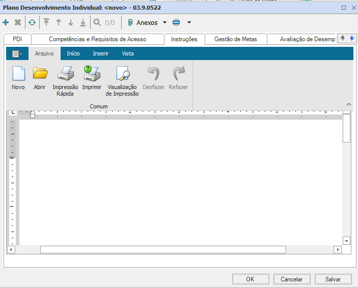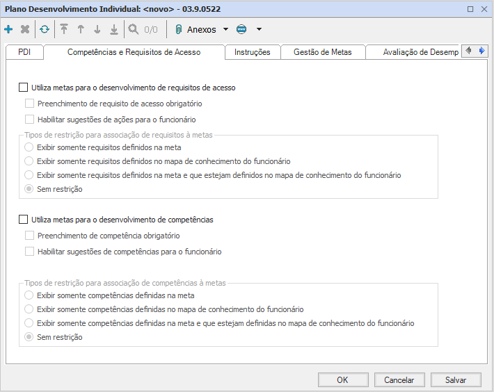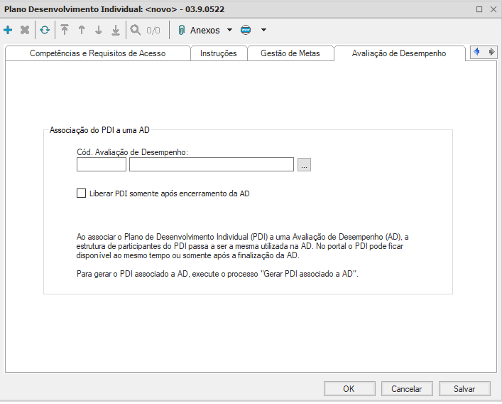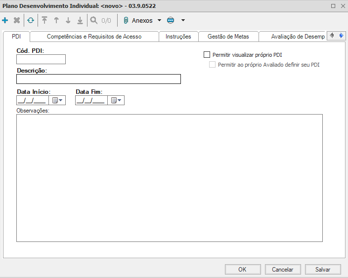O PDI é utilizado para desenvolver competências e/ou requisitos de acesso para determinado colaborador. Na aba seguinte, habilite os campos referentes ao PDI que está sendo criado