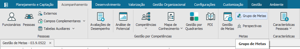 Permite definir os grupos à que as metas serão vinculadas, utilizadas para criar grupos de metas administrativas ou sistêmicas. Para realizar esse cadastro selecione a opção “Grupo de Metas” na aba “Acompanhamento”