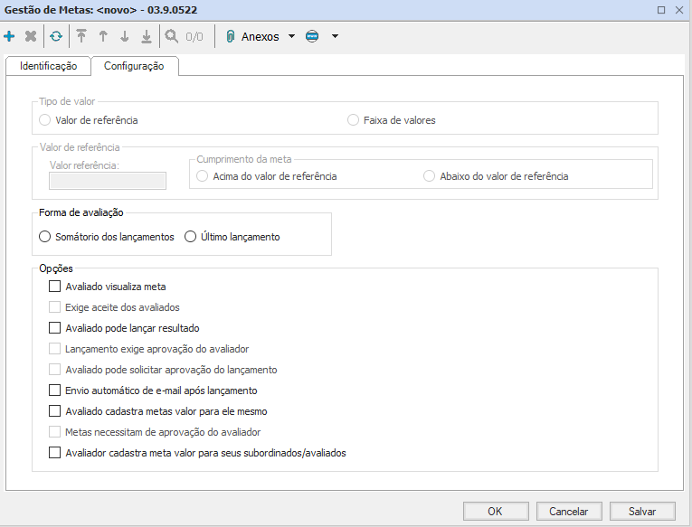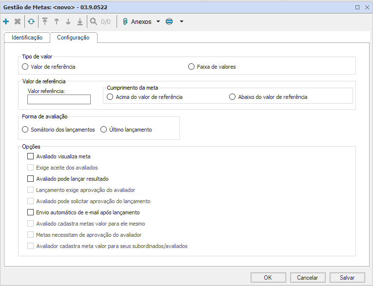 - Já no caso da meta definida como meta valor, em configurações, os campos de Referência, faixa de valores e cumprimento de metas estão ativos.