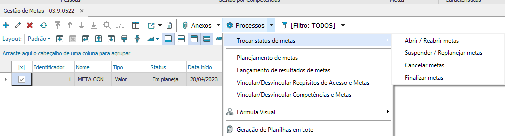 Na interface de Gestão de Metas, é possível alterar o status das metas criadas, clicando na opção “Processos-Trocar status de Metas” e em seguida escolhendo a opção desejada