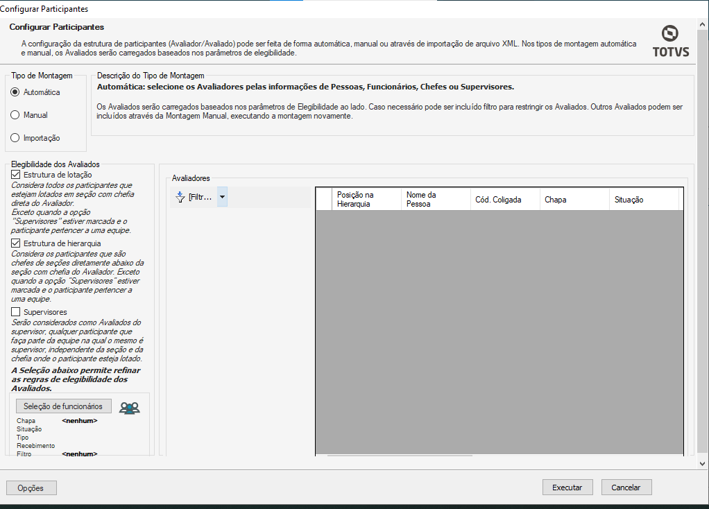 Escolha o tipo de montagem: automática (o sistema vai utilizar os parâmetros de “Elegibilidade”), manual (é necessário selecionar os avaliadores e os avaliados) ou importação (realizada através de arquivo XML), após realizar essa etapa clique em “Executar”