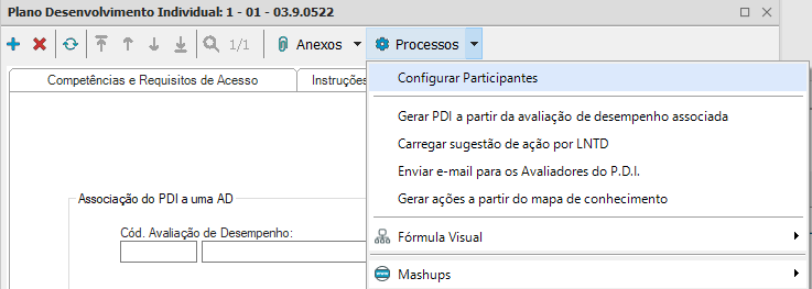Importante: Se o PDI for vinculado à uma avaliação de desempenho os participantes que constam nela, irá fazer parte do PDI que está sendo criado, entretanto, se a opção escolhida for não vincular uma avaliação de desempenho, tem que configurar os participantes. Para realizar essa etapa clique em “Processos- Configurar Participantes”
