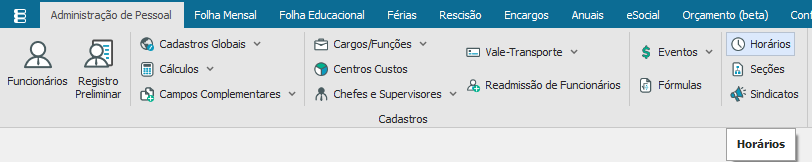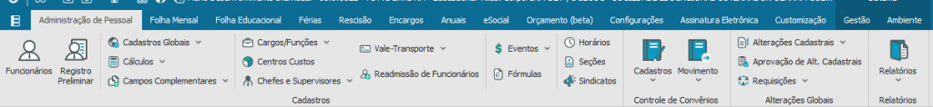 Os cadastros abaixo fazem parte do “Módulo RH- Folha de Pagamento” aba “Administração de Pessoal”