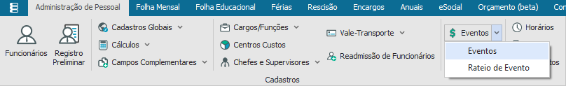 Eventos são cadastros que representam as verbas a serem lançadas e calculadas na folha de pagamento. Para realizar o cadastro, clique em “Eventos- Eventos ”