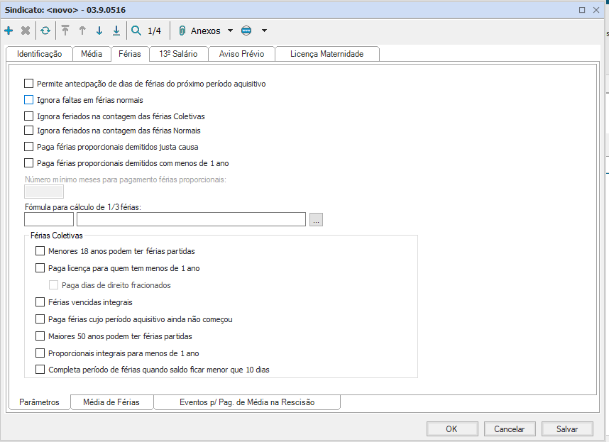 Fórmula para cálculo de 1/3 de Férias: Permite utilizar percentual distinto do previsto na Constituição, por força de convenção ou contrato coletivo. Quando não informado a fórmula, é calculado 1/3 sobre as férias e médias;