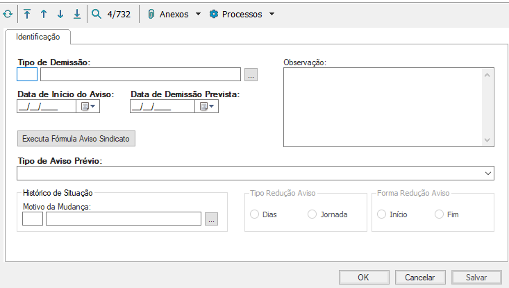 Ao clicar nessa opção preencha os dados do cadastro de acordo com o funcionário, com o tipo de demissão, data de início do aviso e da demissão prevista, o tipo de aviso prévio e o histórico da situação
