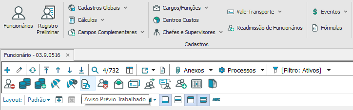 O Aviso Prévio Trabalhado ocorre quando o empregado trabalha normalmente durante o prazo do Aviso Prévio. Para realizar esse cadastro, selecione o funcionário desejado e clique na opção “Aviso Prévio Trabalhado” que consta no menu principal da opção “Funcionários”