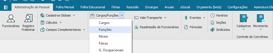 É o cadastro das funções exercidas dentro da empresa. Para realizar esse cadastro escolha a opção “Cargos/Funções- Funções”