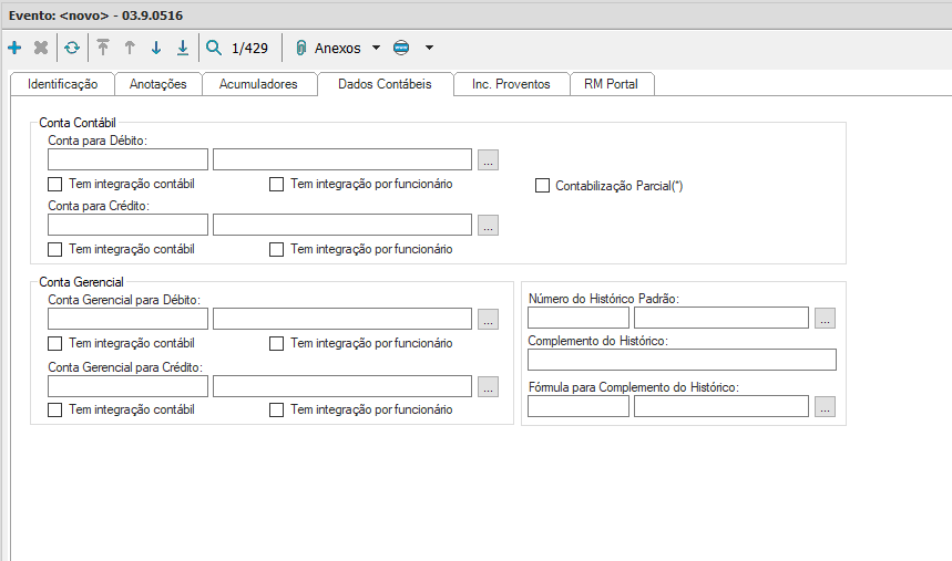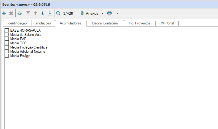 3- Aba “Acumuladores”, habilite os campos necessários de acordo com o evento que está sendo cadastrado