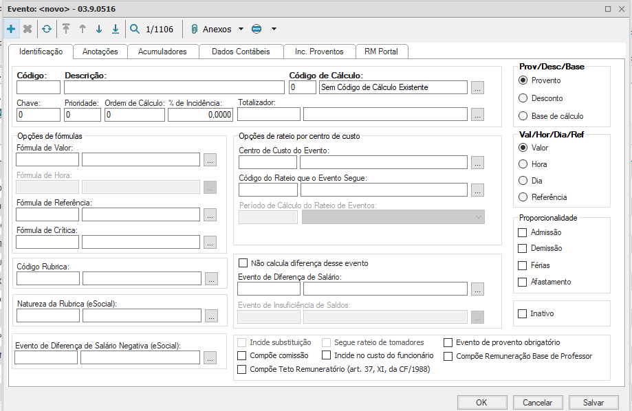 % de Incidência: utilizado quando o evento é tipo hora, nos casos dos eventos que não são do tipo hora, deixar “0”;
