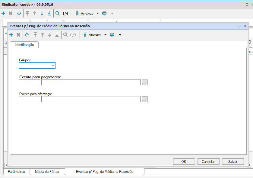 A terceira aba “Eventos p/Pag. de Média na Rescisão”é onde são adicionado os eventos de acordo com as médias a serem pagas na rescisão. Ao selecionar essa aba clique em incluir e preenhca as etapas do cadastro