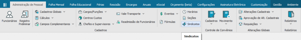 É a área onde são cadastrados os sindicatos aos quais os Funcionários são conveniados, como SAAESEMG e SIMPRO. O cadastro possibilita parametrizações das médias, férias, 13º salário, licença maternidade e aviso prévio, relativas a CLT ou Convenções Coletivas dos sindicatos dos trabalhadores. Esse cadastro fica na opção “Cadastros- Sindicatos”
