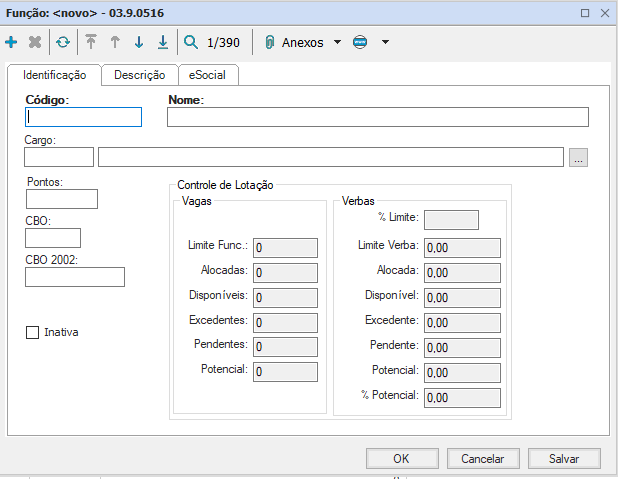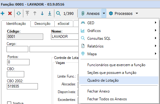Dentro do cadastro de função para realizar o controle de segurança e medicina do trabalho, escolha a opção “Anexos- Quadro de Lotação” e clique em “incluir”