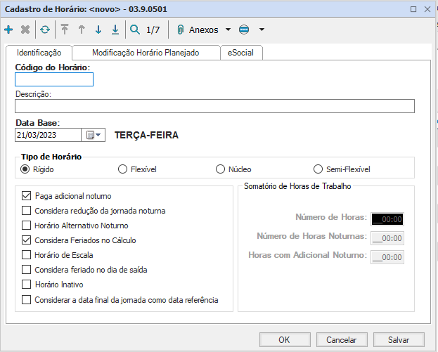 Data Base: Esse campo vem preenchido por default com o primeiro dia do período do Automação de Ponto. Pode ser alterado conforme a necessidade no cadastramento do horário;