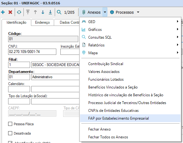 O cadastro do FAP é feito de duas formas no sistema, a primeira é feita no momento do cadastro de Seções ( Link do Manual), em “Anexos- FAP por Estabelecimento Comercial”.